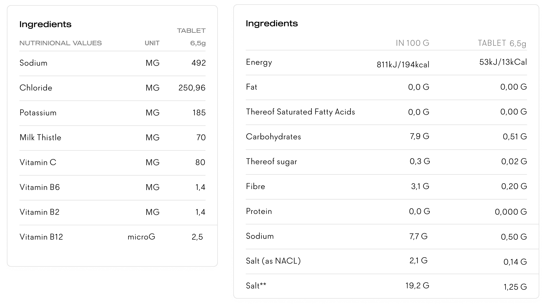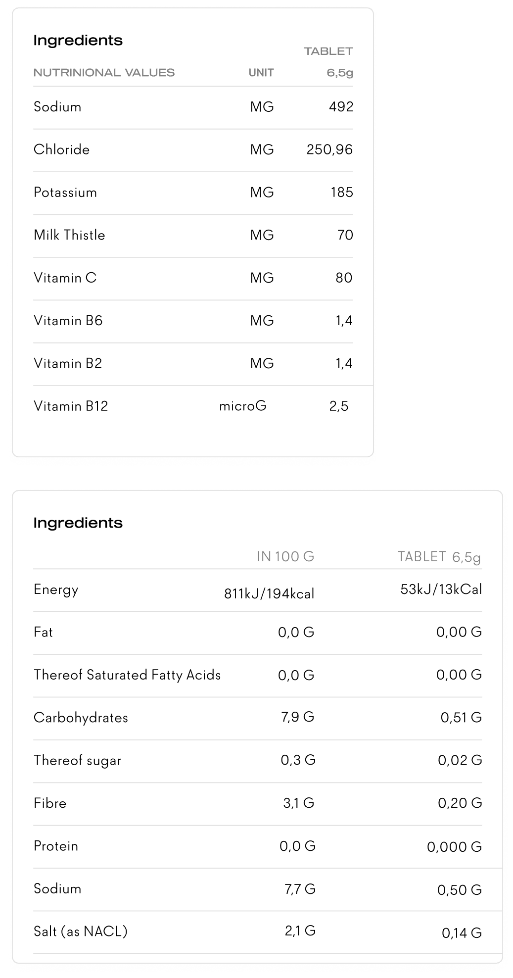 Ingredients: Acid citric acid, sodium hydrogen carbonate, humectant sorbitol, potassium chloride, inulin, sodium, chloride, milk thistle extract (70mg per tablet), L-ascorbicacid (vitamin C), anti-caking agent tricalcium phosphate, natural flavourings, sucralose, sweetener steviol glycosides from stevia, riboflavin 5’- phosphate- sodium (vitamin B2), pyridoxine hydrochloride (vitamin B6), cyanocobalamin (vitamin B12).